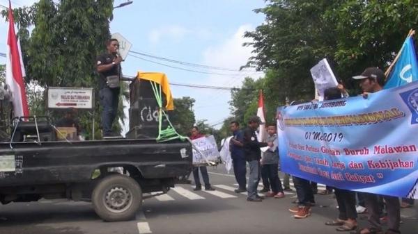 Pantauan iNews, sejumlah massa buruh memperingati May Day dengan aksi unjuk rasa di depan Kantor Bupati Jombang. Mereka membawa spanduk dan poster berisi sejumlah tuntutan terkait kesejahteraan para buruh.