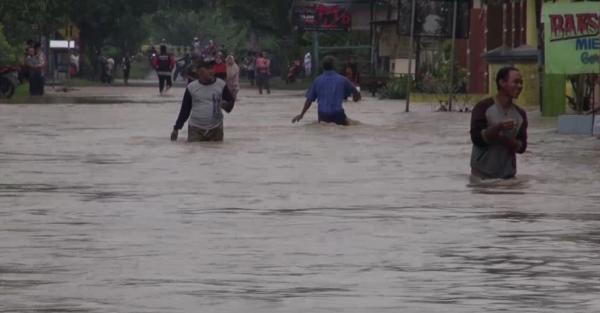 Banjir menggenangi ruas Jalan Raya Desa Catakgayam dan di Desa Selorejo, Kecamatan Mojowarno, Kamis (22/2/2018). (Foto: iNews/Muchtar Bagus)