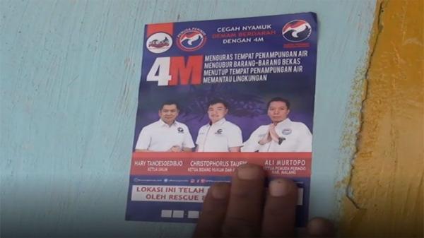 Selain melakukan fogging, tim Rescue Perindo juga menempelkan stiker berisi imbauan untuk mencegah penyebaran penyakit DBD di tiap rumah warga.