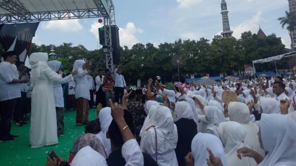 Ketua Dewan Pengarah JKSN Khofifah Indar Parawansa didampingi Ketua TKN Erick Thohir berorasi di depan ribuan kader Muslimat NU di Alun-alun Jombang, Jatim, Sabtu (2/2/2019). (Foto: iNews.id/Ihya' Ulumuddin)