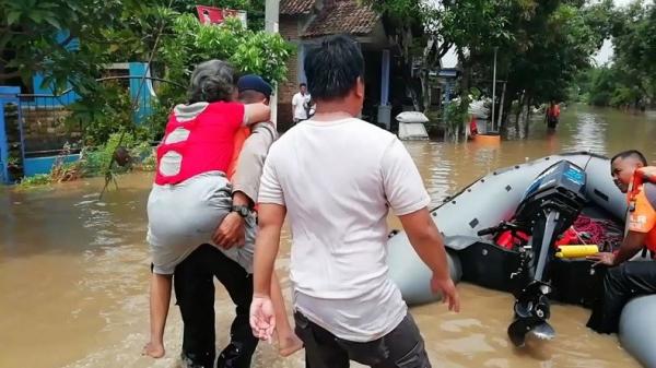 Petugas Kepolisian menggendong warga lansia yang sempat terjebak banjir di rumahnya, Kabupaten Madiun, Jatim, Rabu (6/3/2019).(Foto: iNews/Arif Wahyu Efendi)