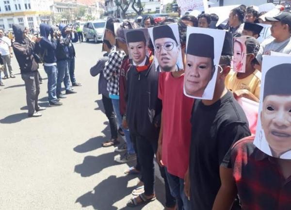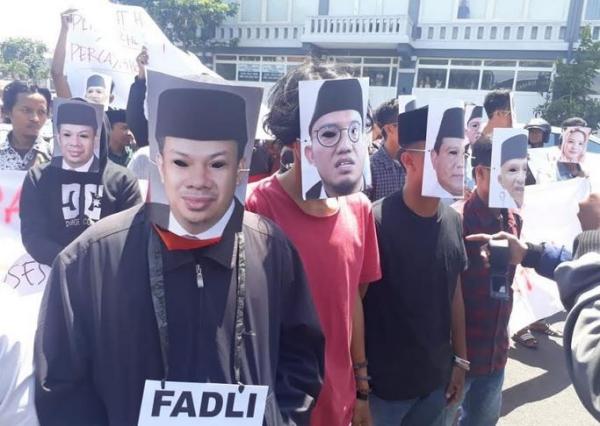 Tak hanya berorasi, mereka juga menggelar teatrikal dengan mengenakan topeng para tokoh elite politik yang diduga menyebarkan kabar hoaks. Tokoh politik itu di antaranya Prabowo Subianto, Sandiaga Uno, Amien Rais, Fadli Zon, Rachel Maryam, Danhil dan Ratna Sarumpaet.