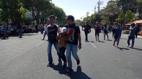 Polisi mengamankan pelajar SD yang melemparkan bom molotov di sekitar Gedung DPRD Jatim, Surabaya, Kamis (26/9/2019). (Foto: iNews.id/Ihya' Ulumuddin)