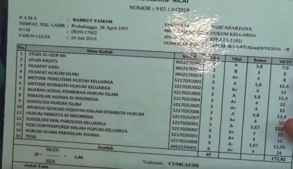 Dengan ketekunan dan kemampuan akademiknya, Badrut Tamam yang lulus S-2 Jurusan Hukum Keluarga di Program Pasca-Sarjana IAIN Jember meraih nilai IPK 3,86.
