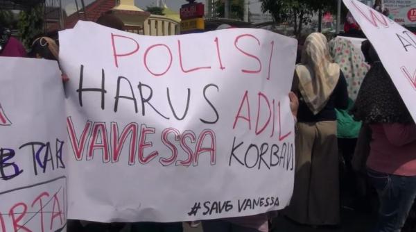 Mengatasnamakan "Emak-emak Militan se Jawa Timur Pecinta Vanessa Adzania”, para demontran ini meminta polisi bertindak adil. Tidak hanya mengusut muncikari dan pelaku, tetapi juga pria hidung belang.