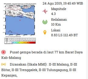 “Gempa Mag:4.3, 24-Agu-19 19:45:49 WIB, Lok:8.83 LS, 112.49 BT (Pusat gempa berada di laut 77 km Barat Daya Kab-Malang), Kedlmn:10 Km Dirasakan (MMI) II-III Malang, II-III Blitar, II-III Trenggalek, II-III Tulungagung, II-III Kepanjen,” tulis @infoBMKG, akun twitter resmi BMKG, Sabtu (24/8/2019).