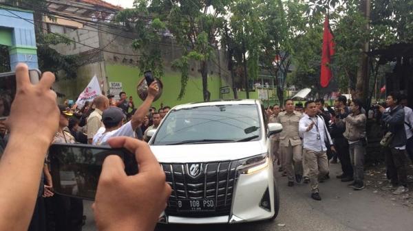 Kedatangan mobil yang membawa rombongan Capres Prabowo Subianto disambut spanduk dan yel-yel dukungan untuk Capres Joko Widodo, Selasa (19/2/2019). (Foto: iNews.id/Ihya' Ulumuddin)