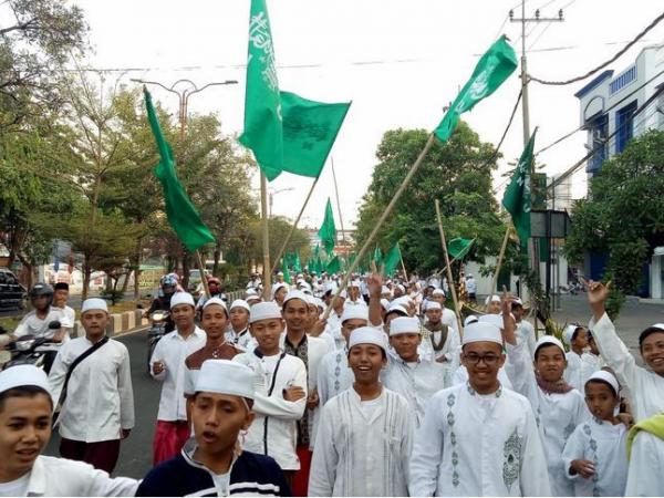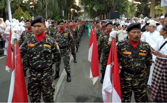 Arak-arakan ratusan ribu santri ini dipimpin pasukan Barisan Ansor Serbaguna (Banser) dengan membawa bendera merah pitih dan Nahdlatul Ulama (NU) serta marching band.