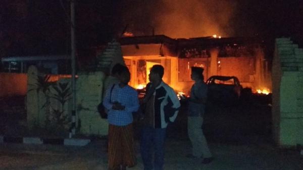Api dengan cepat berkobar dan menghanguskan seluruh bangunan. Tak hanya itu sebuah mobil patrol yang terparkir di halaman mapolsek juga hangus jadi arang.