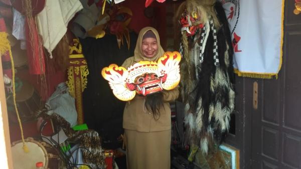 Dini Anggraini (20) lalu meliuk-liukkan tangannya, tubuh berlenggak-lenggok mengiringi musik. Lalu, seorang pria memakai topeng barong mendekatinya, menari bersama.