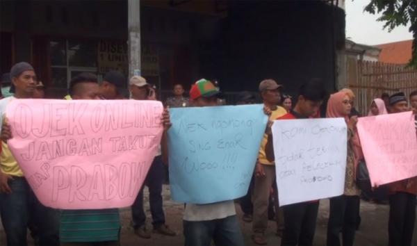 Massa menuntut capres Prabowo meminta maaf secara terbuka kepada seluruh tukang ojek di Indonesia. Sebab, pernyataan Prabowo dianggap melecehkan profesi tukang ojek yang tergabung di ojek pangkalan maupun ojek online.