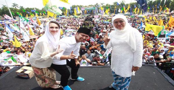 Cagub Khofifah Indar Parawansa (kanan) dan Cawagub Emil Dardak (tengah) didampingi istrinya, Arumi Bachsin saat kampanye akbar perdana di Alun-Alun Jombang. (Foto: iNews.id/Ihya' Ulumuddin).