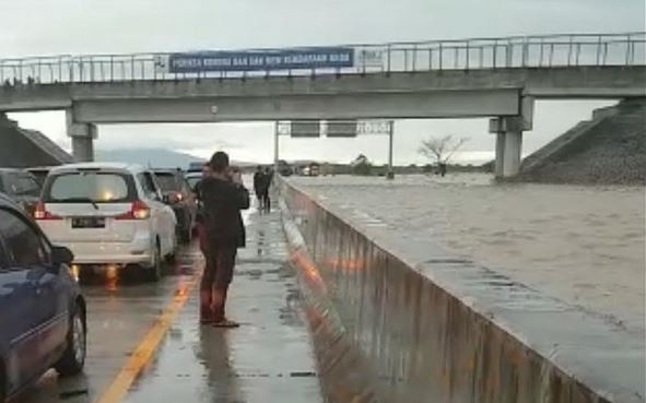 "Ada tanggul yang jebol sehingga air meluber ke persawahan dan masuk ke ruas tol," katanya.