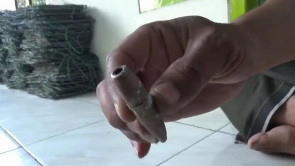 Selongsong peluru yang nyasar ke rumah warga di Desa Semedusari, Kecamatan Lekok, Kabupaten Pasuruan, Jatim, pada Selasa (2/7/2019). (Foto: iNews/Jaka Samudra)