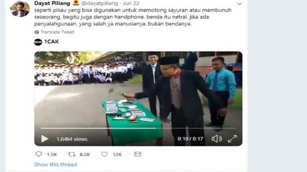 “Oke mungkin sudah ada perjanjian tertulis terkait aturannya. tapi aku masih meyayangkan saja jika handphonenya harus dihancurkan. kan mubazir. kan masih ada cara lain, misal; dijual, lalu uangnya digunakan untuk hal yang bermanfaat,” tulis Dayat Piliang dalam akun Twitter-nya @dayatpiliang, Senin (24/6/2019).