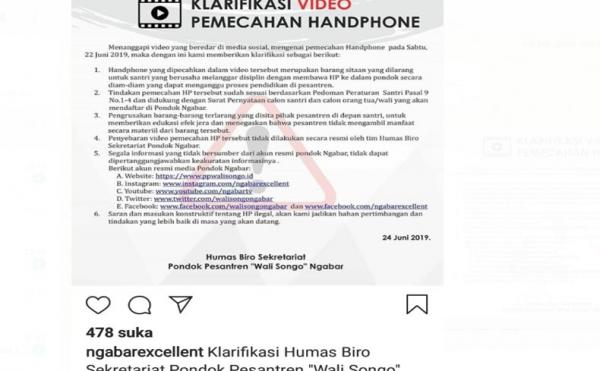 Lewat akun Instagramnya @Ngabarexcell, Ponpes Ngabar melakukan klarifikasi terkait beredarnya video perusakan HP tersebut.